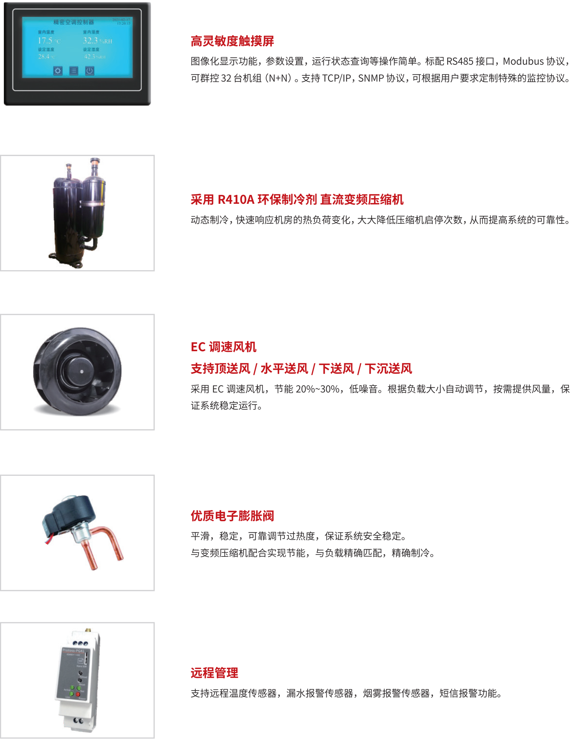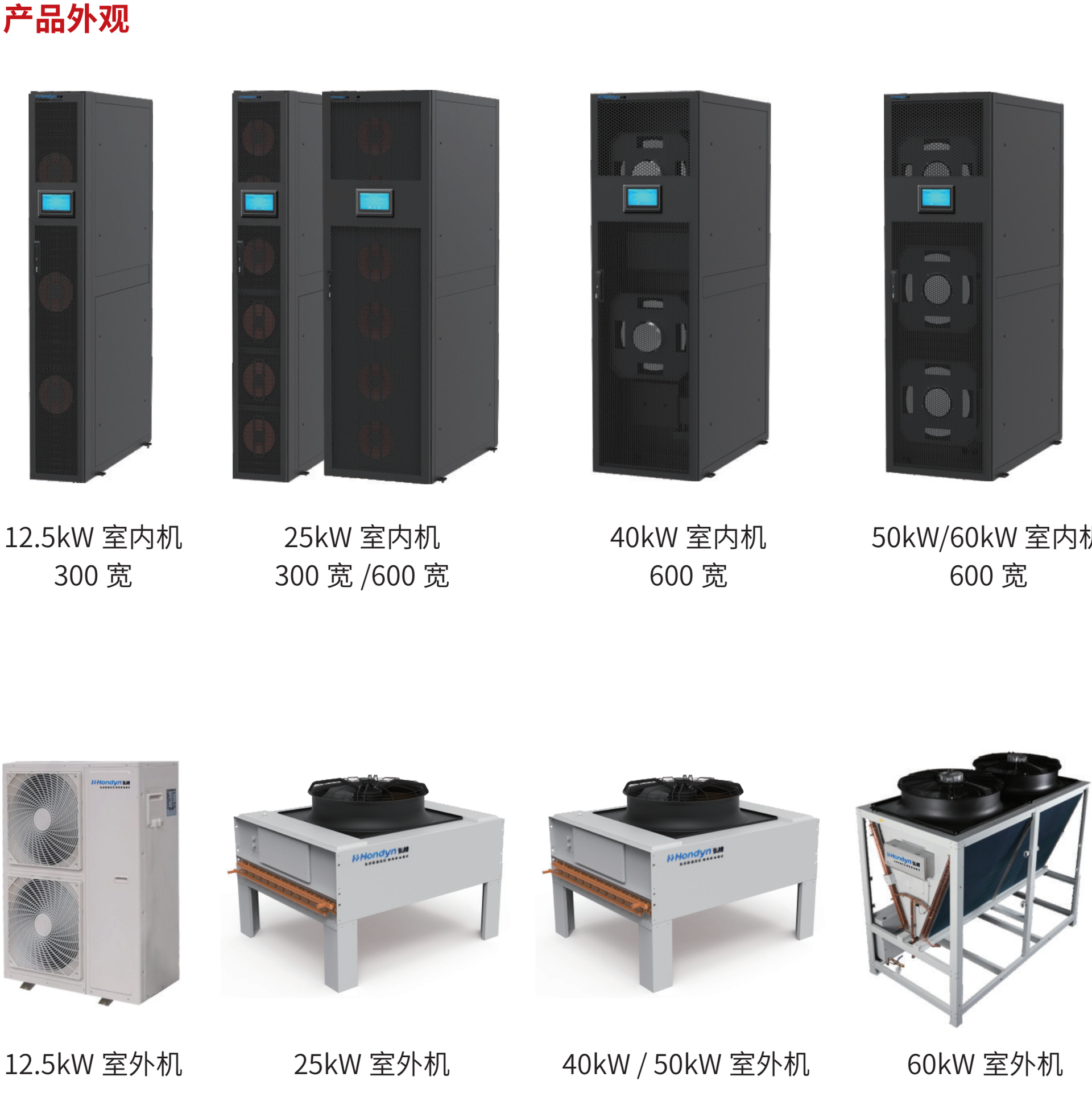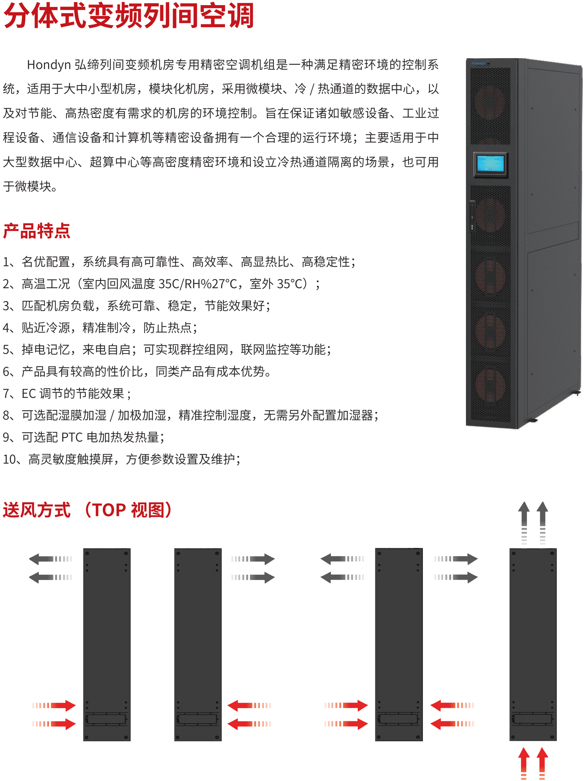 Hondyn 弘缔列间变频机房专用精密空调机组是一种满足精密环境的控制系统,适用于大中小型机房,模块化机房,采用微模块、冷 / 热通道的数据中心,以及对节能、高热密度有需求的机房的环境控制。旨在保证诸如敏感设备、工业过程设备、通信设备和计算机等精密设备拥有一个合理的运行环境;主要适用于中大型数据中心、超算中心等高密度精密环境和设立冷热通道隔离的场景,也可用于微模块。