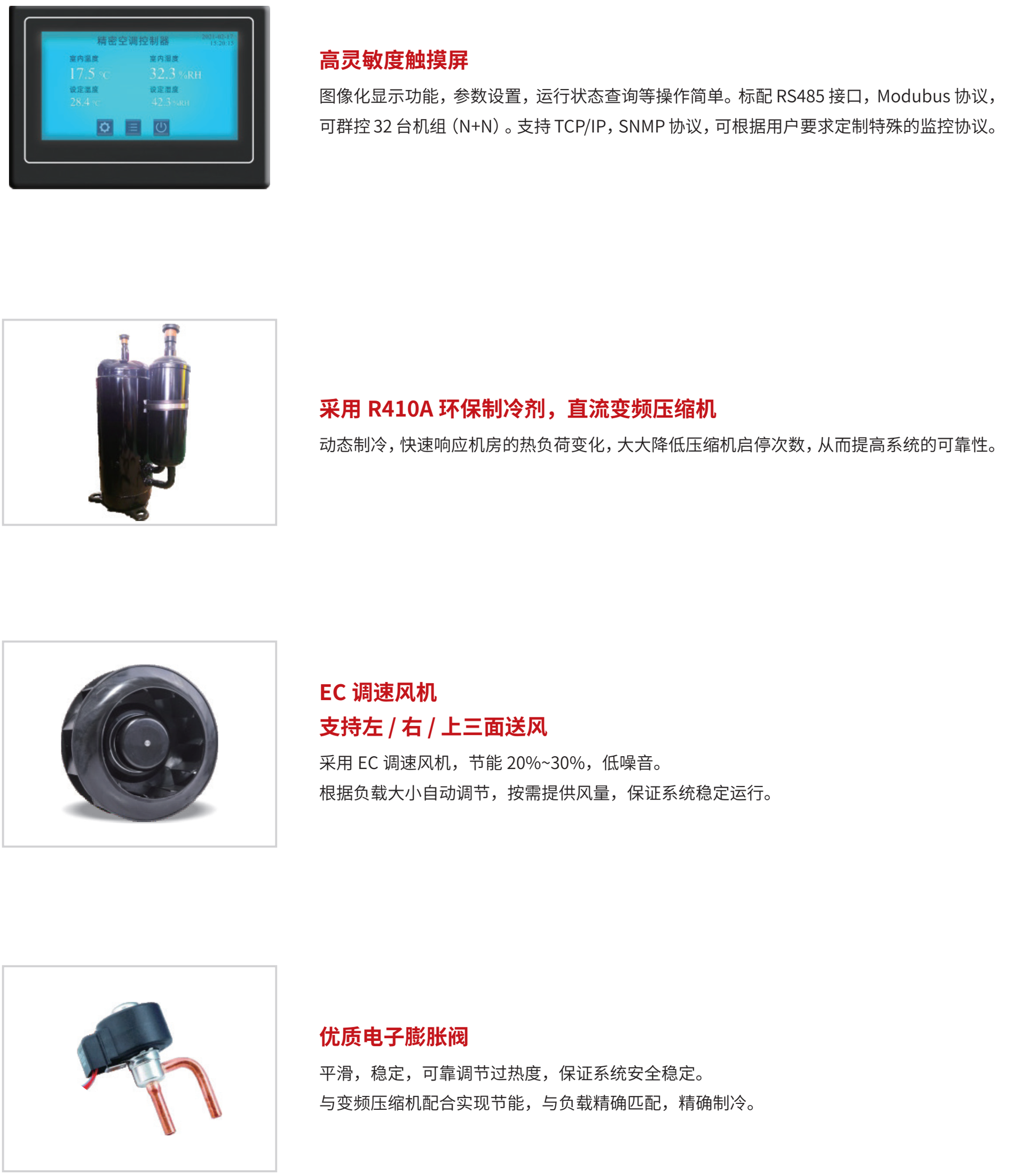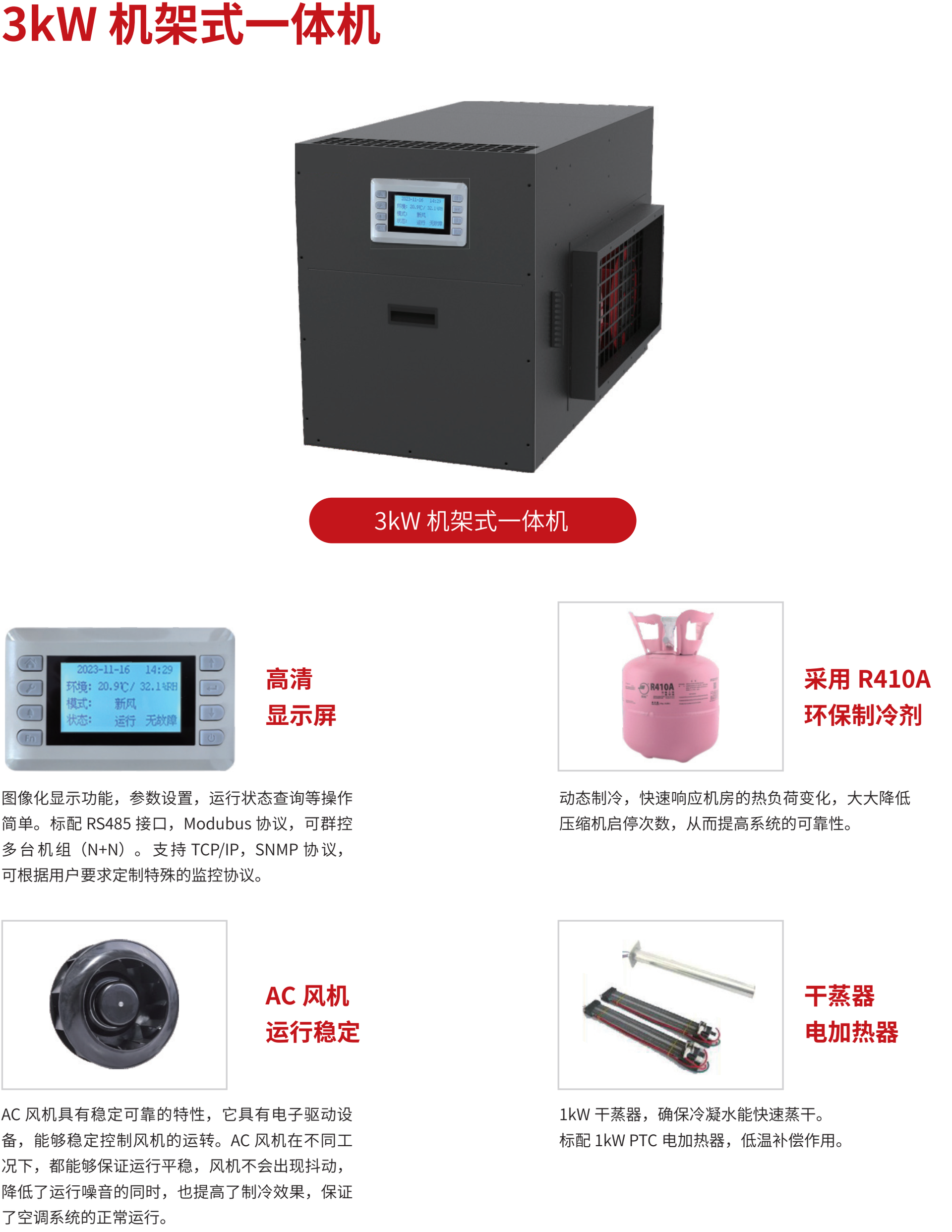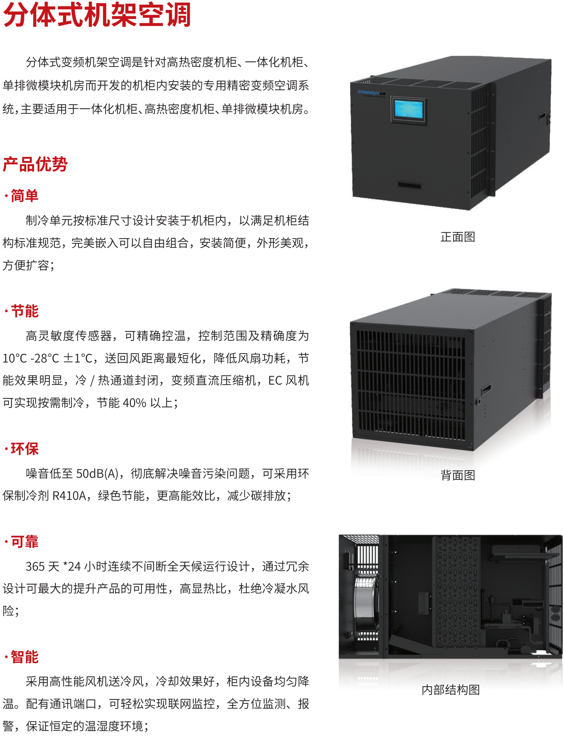 分体式变频机架空调是针对高热密度机柜、一体化机柜、单排微模块机房而开发的机柜内安装的专用精密变频空调系统,主要适用于一体化机柜、高热密度机柜、单排微模块机房。